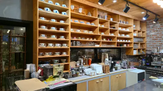 안에 들어서자마자 눈에 들어온 건 카운터 뒤쪽 벽면을 가득 채운 커피잔들이었어요. 나무 선반에 빼곡하게 놓인 잔이 수십 개는 되는데, 하나하나 디자인이 다 다릅니다. 반대편 회색 벽에도 선반이 층층이 걸려 있고 거기에도 찻잔이랑 커피 도구들이 진열돼 있었고요. 카운터 위에는 원두가 담긴 유리 병이 줄지어 있고, 에스프레소 머신이랑 그라인더도 보였어요. 로스터리 카페답게 원두를 직접 다루는 곳이라는 게 카운터만 봐도 느껴졌습니다.