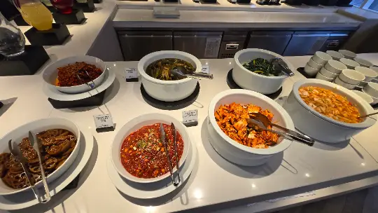 هذا ركن الأطباق الجانبية الكورية، أو ما يسمونه عادة البانتشان. كان فيه جذور لوتس مطهوة، وكيمتشي، وكيمتشي طازج، وسبانخ متبلة، وأنواع مخللات مرتبة على صف واحد. بالنسبة لي، تنوع هذا الركن يقول كثير عن مدى اهتمام الفندق ببوفيه الفطور، وشيلا ستاي أولسان كان جيداً جداً بالنسبة لفندق أعمال. وبما أني صورت كل صنف، سأمشي عليها واحدة واحدة.