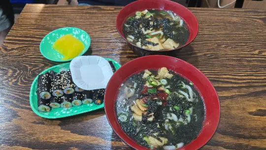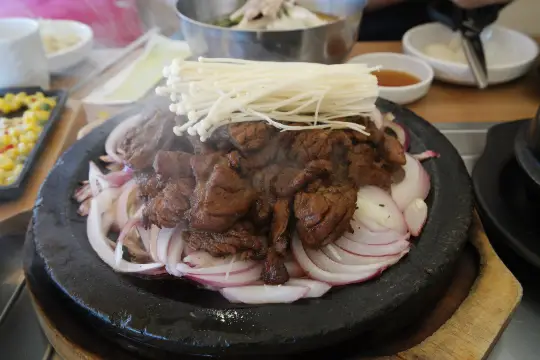 بينما كانت الشواية تسخن، صفّوا على الطاولة حساء ميسو (حساء فول الصويا المخمّر)، جابتشاي (نودلز زجاجية)، خضروات للف، ثوم، بصل، وسامجانغ (صلصة غمس حارة). اللحم المتبّل الصغير اللي كان أمامنا كان مجرد عيّنة تذوق، لكن صديقي لما شافه مدّ إيده وقال "هذا مش من المقبلات؟" لحقت عليه بالكاد.