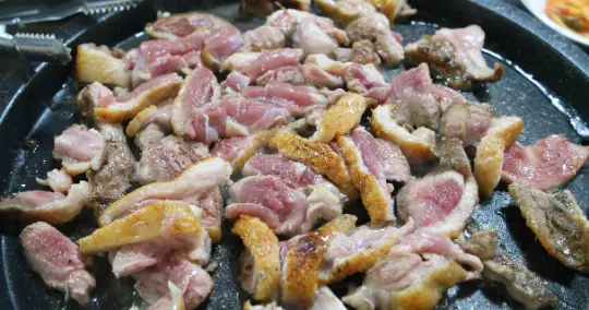 近くで見るとこんな感じ。皮は薄くパリッとしたまま残っていて、中の身は白くしっとり。韓国の人に「子供の頃、家で魚を焼いてもらった?」と聞くと、大体イシモチかタチウオの名前が真っ先に出てきます。それぐらい韓国の家庭の食卓に深く根付いている魚なんですが、最近はスーパーに行くと値段がかなり上がっていて。昔はおかず用の安い魚という扱いだったのに、今はもうそうじゃない。だから社員食堂でイシモチの焼き魚が出る日は、同僚の間で「今日はイモニム機嫌いいのかな」なんて冗談が飛び交っていました。