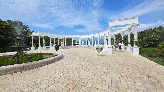 Pirmą kartą pamatęs pagalvojau, kad primena ir graikų šventyklą, ir kažkokio itališko rūmų komplekso sodą. Bet vos tik apsisuki, prieš akis išnyra pietinė Korėjos jūra. Europa lyg ir prieš akis, bet jūra – visiškai korėjietiška. Tas derinys labai savitas.